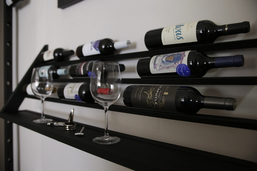 De perfil una diagonal, de frente nuestras botellas. Esta barra suspendida en la pared, fue pensada para aprovechar distintas alturas. La base nos permite exhibir copas, accesorios y hasta más botellas. Cuenta con capacidad para 10 BOTELLAS Ó MÁS! 🍷